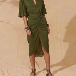 BARBARA robe MARE DI LATTE Robe mi-longue, manches 3/4 et larges, décolleté en V avec petites attaches pour l’ajuster.
