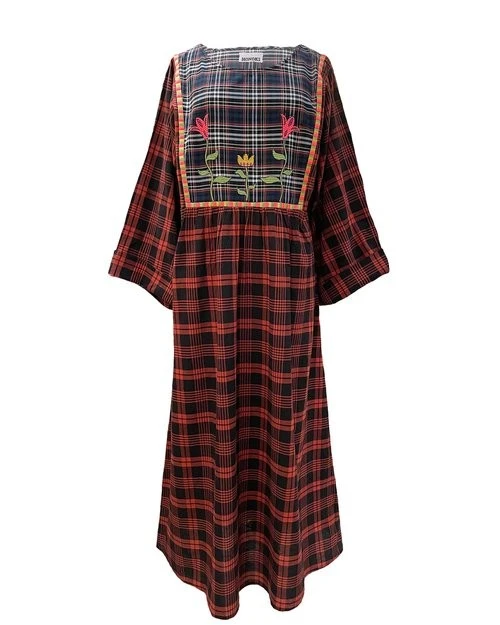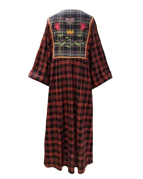 Robe longue caftan col rond en coton, brodée devant et dos.