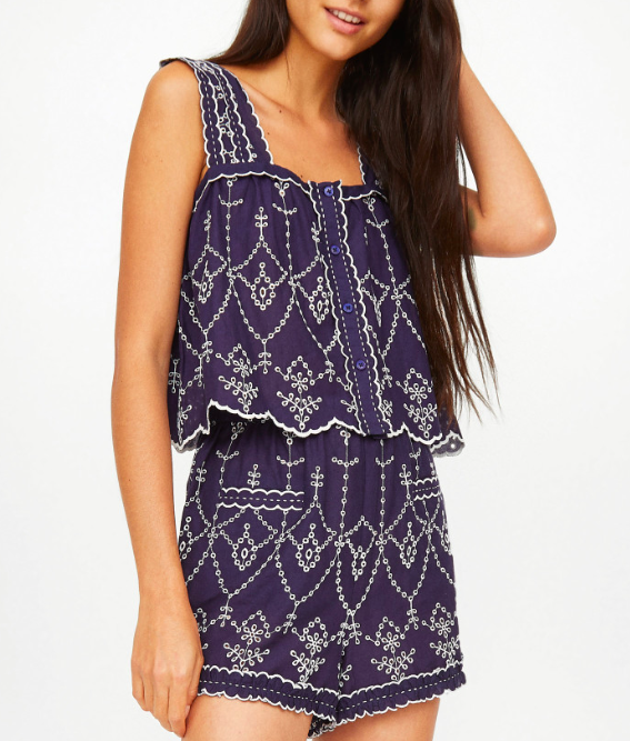 top en coton bleu marine à broderie anglaise contrastées blanches.